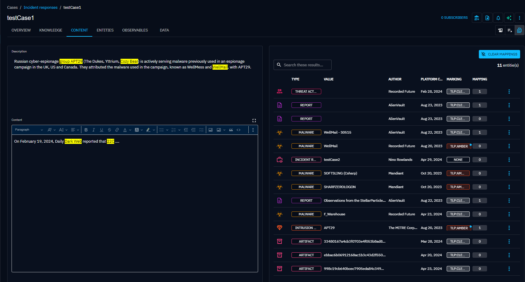 The Content mapping view and the Suggested mapping view  are available for a subset of entities: Report, Grouping, Incident, Incident response, Request for Information, and Request for Takedown.