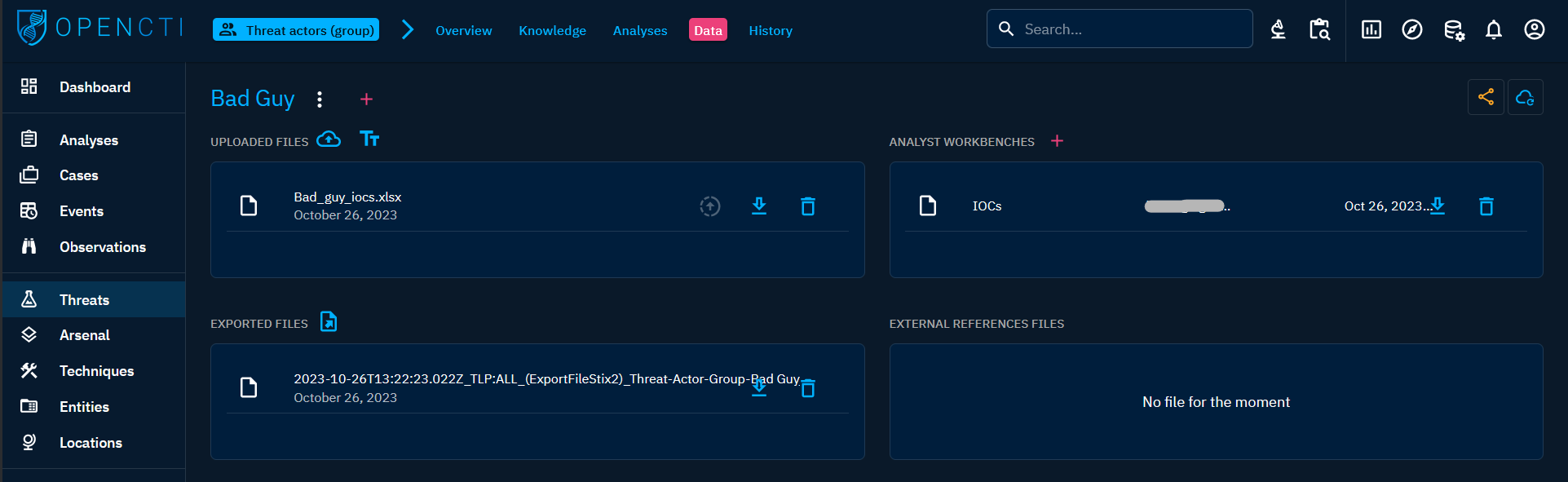 In addition, the Data tab of Threat actors (group), Threat actors (individual), Intrusions sets, Organizations, Individuals have an extra panel: