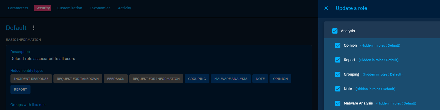 In OpenCTI, the different roles are highly customizable. It is possible to defined default dashboards, triggers, etc. but also be able to hide categories in the roles: