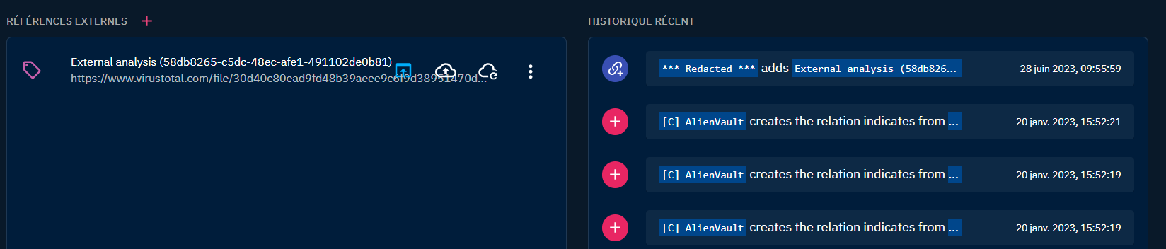 Latest created relationships: display the latest relationships that have been created from or to this Entity. For example, latest Indicators of Compromise and associated Threat Actor of a Malware.latest containers about the object: display all the Cases and Analyses that contains this Entity. For example, the latest Reports about a Malware.External references: display all the external sources associated with the Entity. You will often find here links to external reports or webpages from where Entity's information came from.History: display the latest chronological modifications of the Entity and its relationships that occurred in the platform, in order to traceback any alteration.