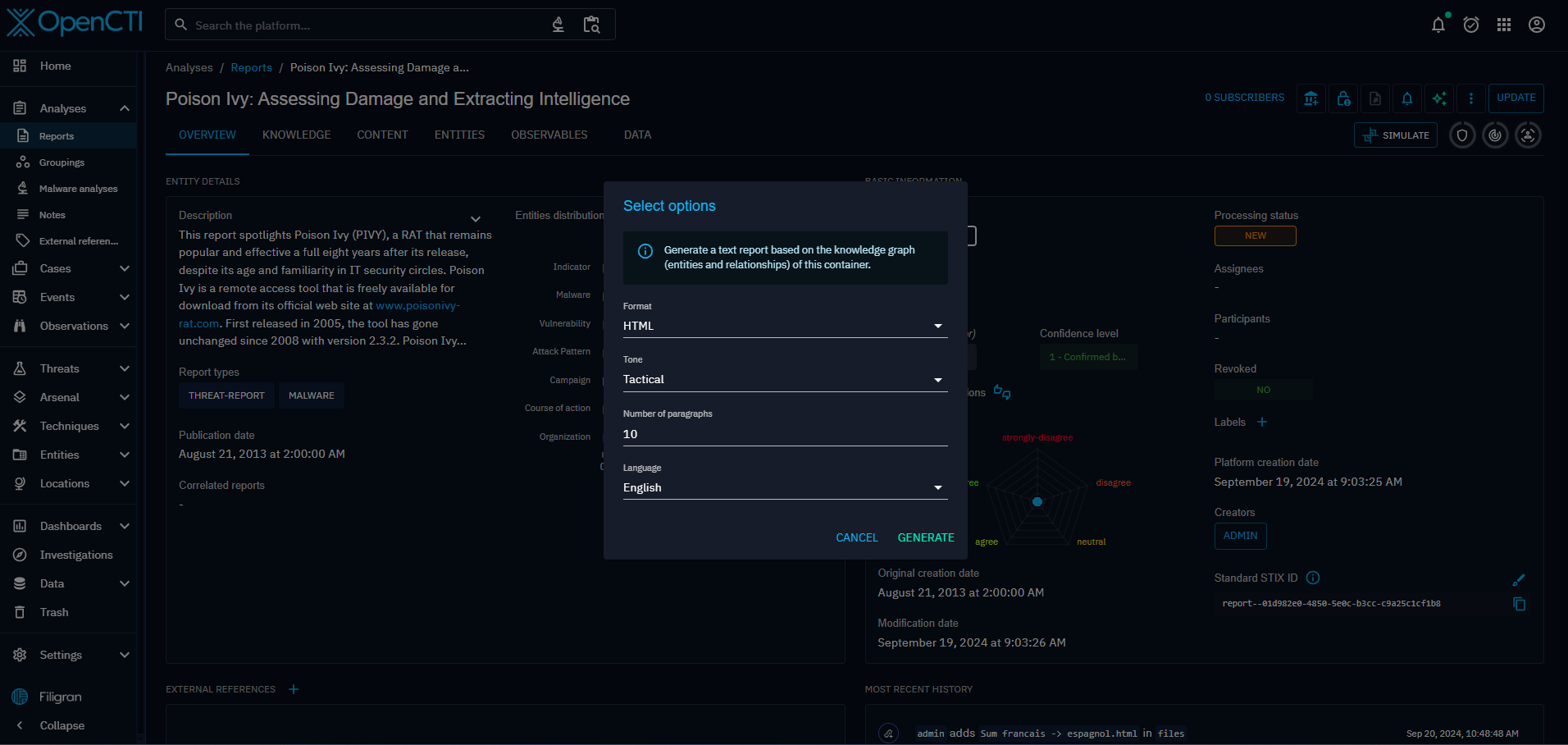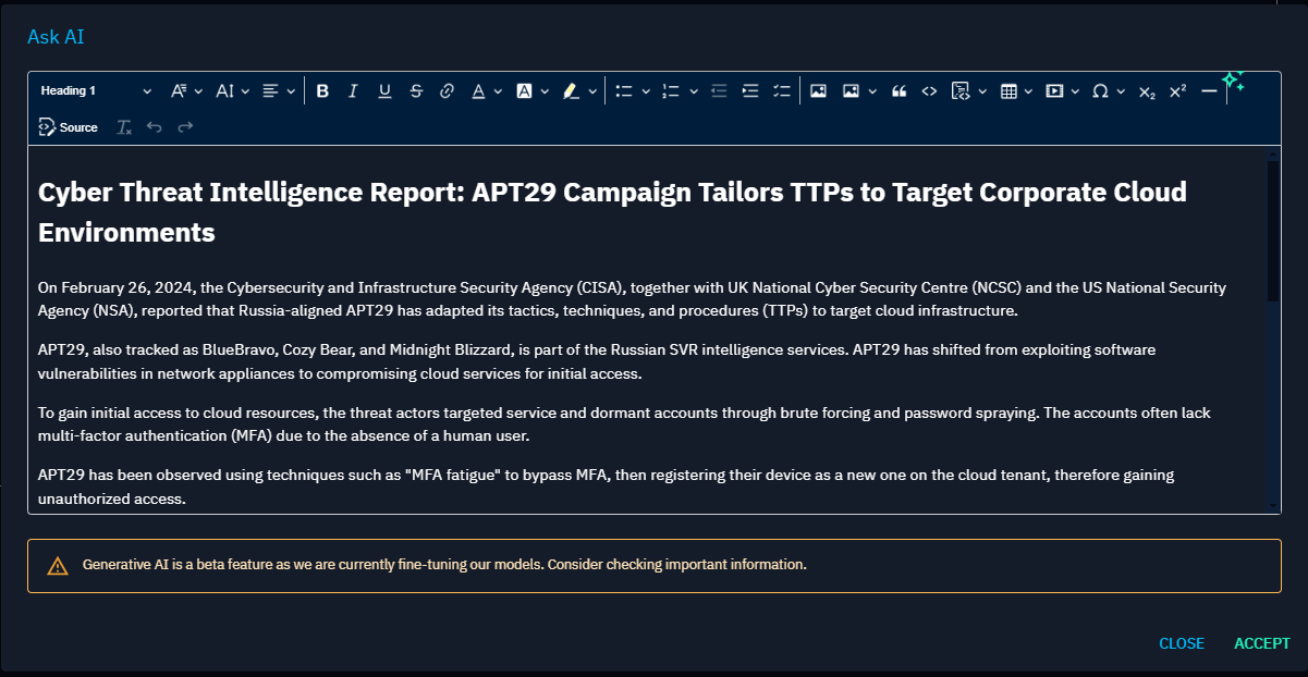 - Change tone: try to change the tone of the text. You can select if you want the text to be written for Strategic (Management, decision makers), Tactical (for team leaders) or Operational (for technical CTI analysts) audiences.