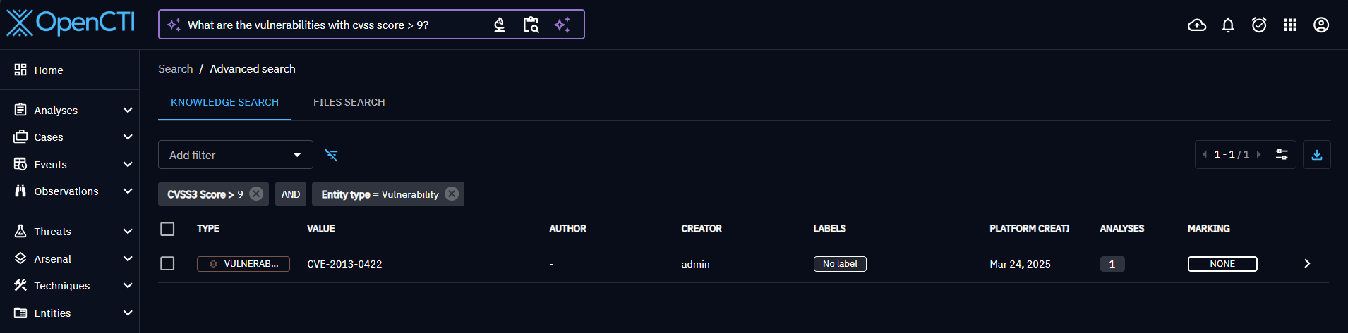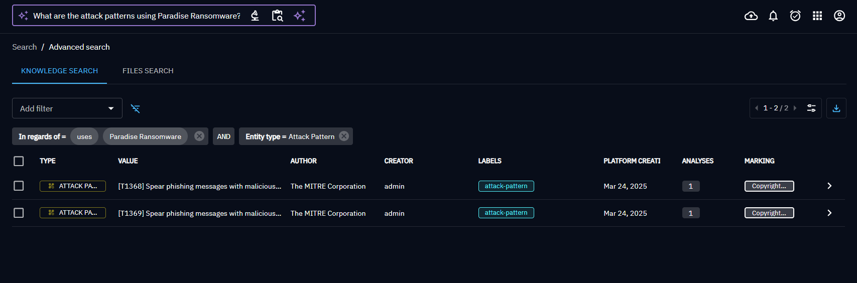 The system uses a Large Language Model (LLM) to generate corresponding filters based on your question. The model constructs filters in the OpenCTI filters format with empty filterGroups. Thus, filters are currently limited to one level of imbrication: a list of filters separated by a single and/or mode.