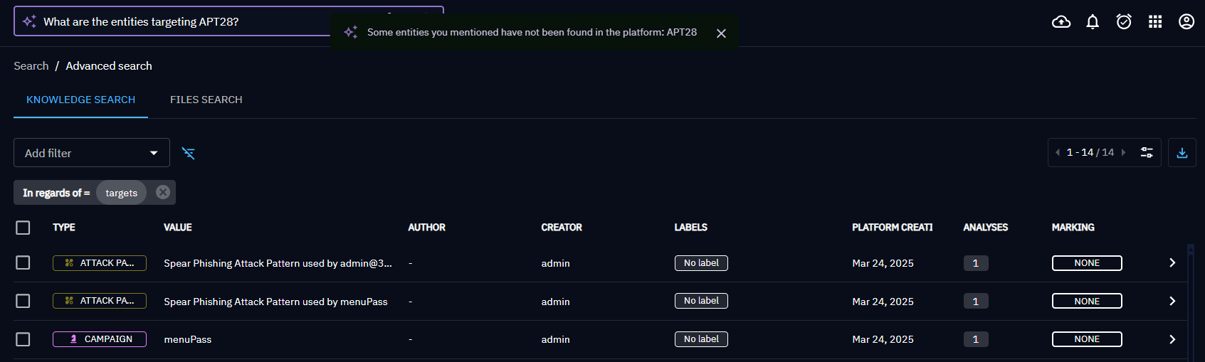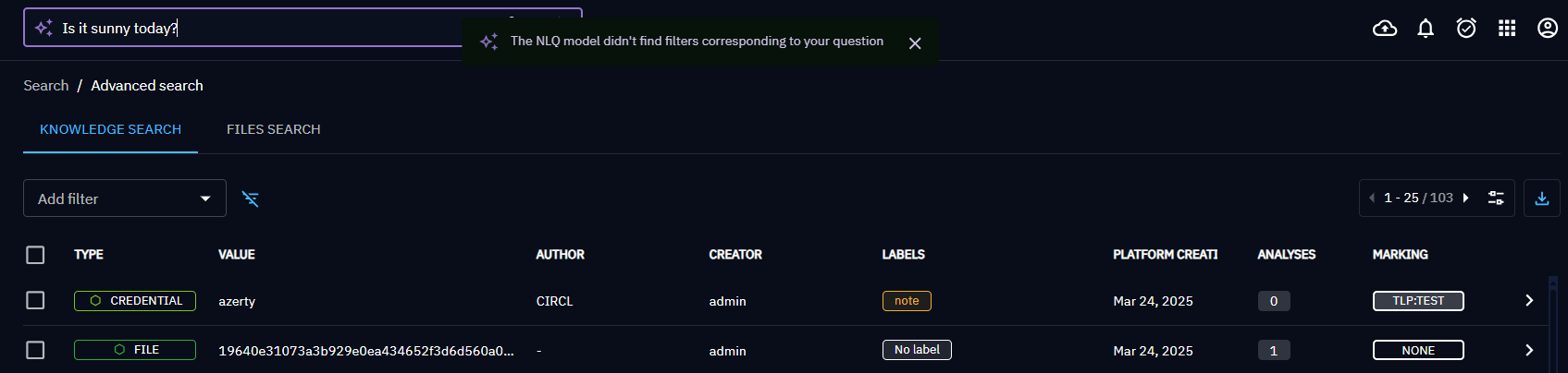 If the question is not understood or out of the OpenCTI cyber context, no filters may be found.