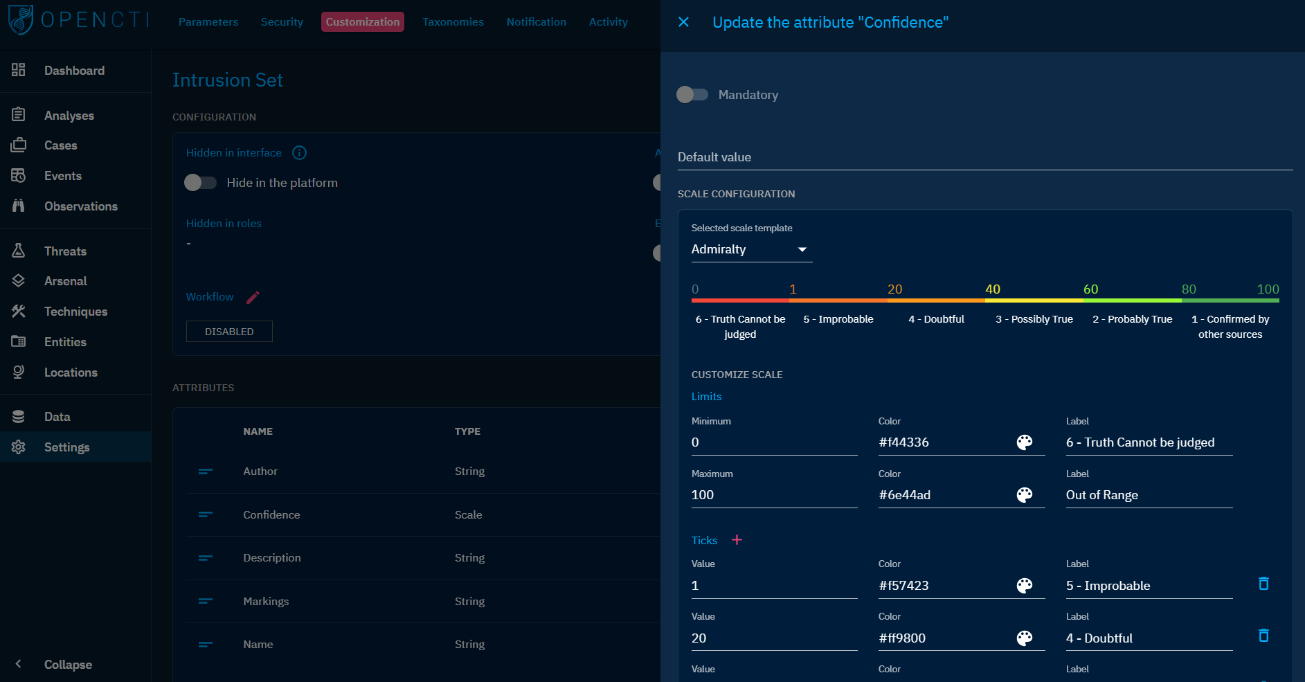 As such customization can be cumbersome, three confidence level templates are provided in OpenCTI: