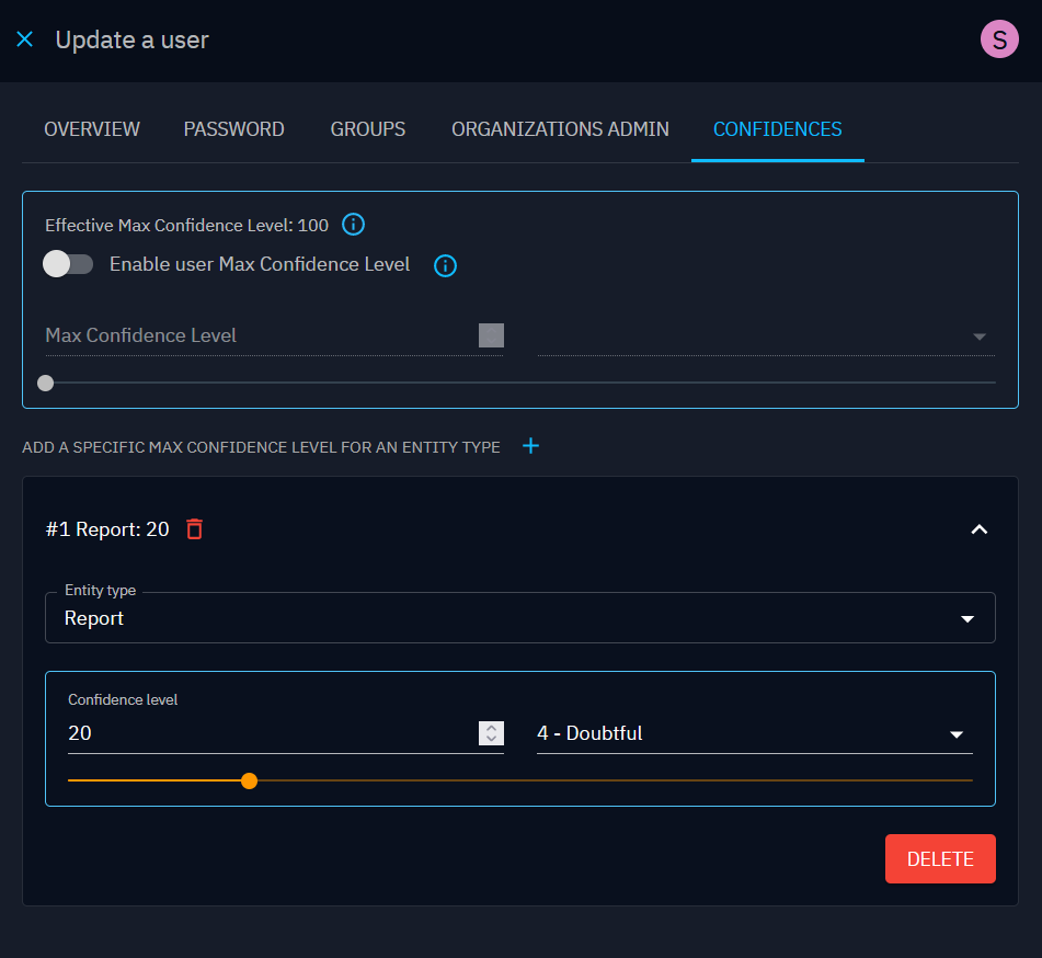 You can set up a maximum confidence levels from the Confidences tab in the edition panel of your user or group. The value can be selected between 0 and 100, or using the admiralty scale selector.