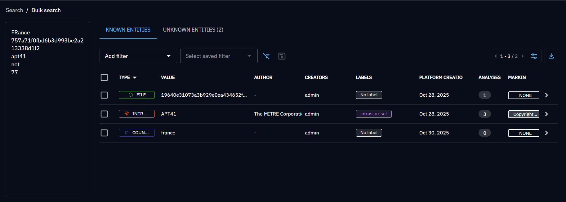 The search keyword used here is taken into account if you decide to export the current view in a file such as a JSON STIX bundle or a CSV file.