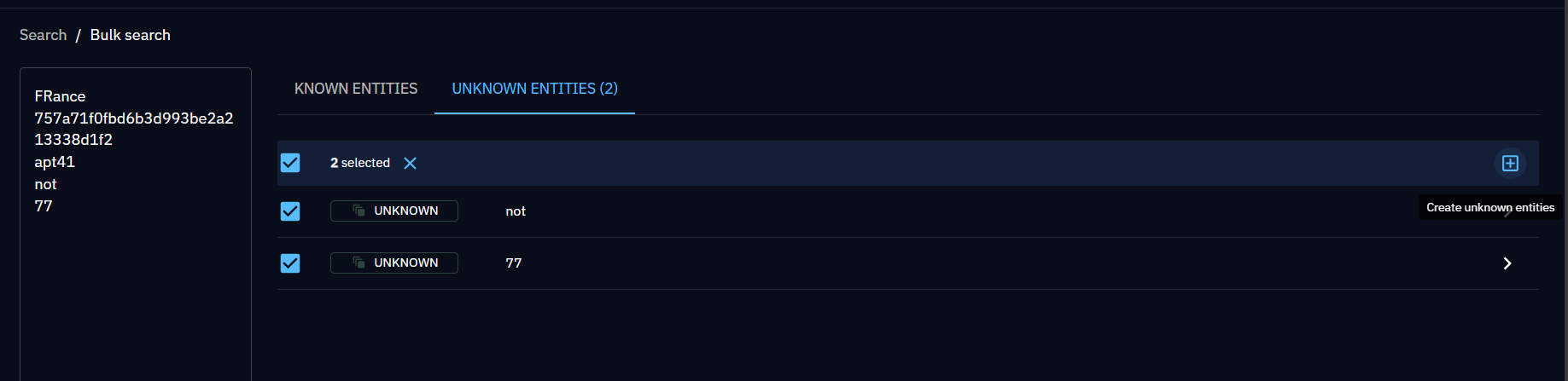 Found entities are listed in the Known entities panel. You can export them or launch massive operations on them, like in other entities lists.