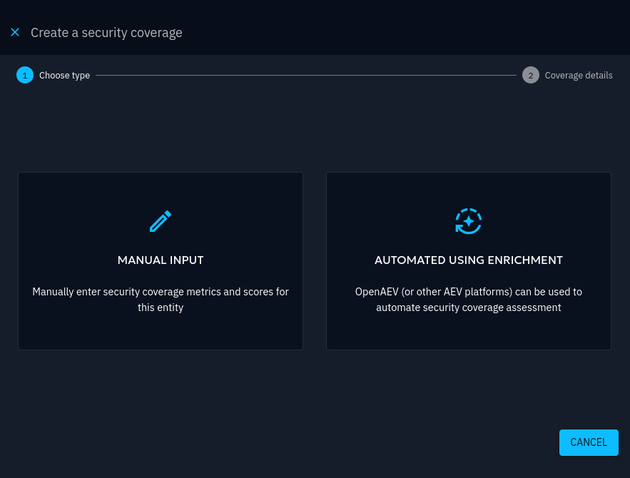 In the first step of the creation form, users wanting to leverage OpenAEV for the Security Coverage should choose the Automated using Enrichment option, which becomes enabled when the "OpenAEV Coverage" connector is up and healthy and proceed to fill in the second step of the form.