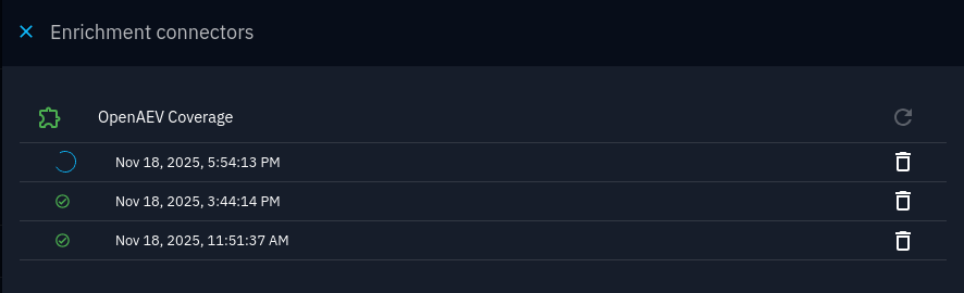 This opens a panel where are listed the attempts at actioning OpenAEV for fulfilling the automated coverage assessment. It is possible to retrigger the action manually by pressing the circular arrow icon (top right in the panel), in case the previous attempt had failed or if it is necessary to request an updated assessment (e.g. because the contents of the linked report has changed):