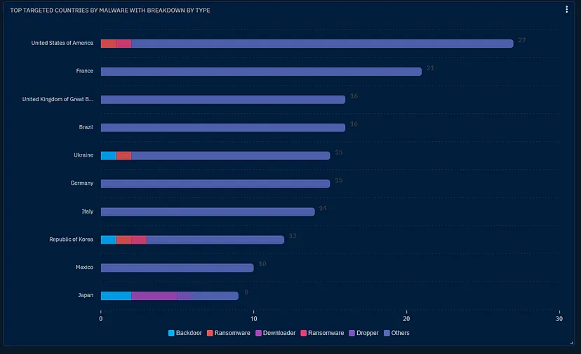 Use case example: I need to understand what are the most targeted countries by malware, and have a breakdown for each country by malware type.