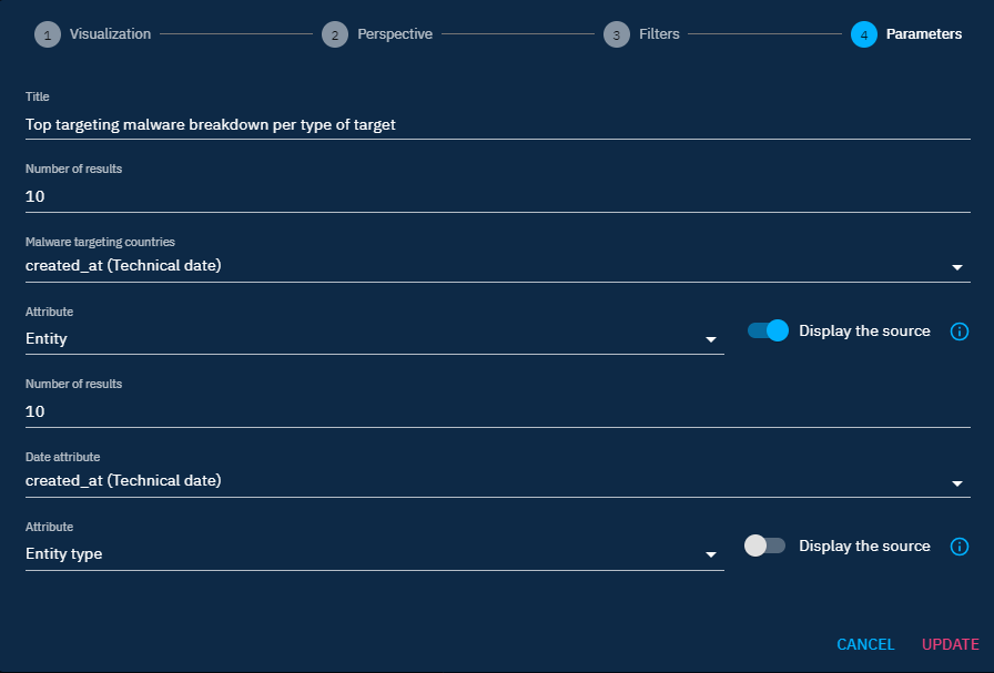 Source type = Malware AND Target type = Countries AND Relation type = Targets. Add a label to your dataset. - Add an entity data set by using access button