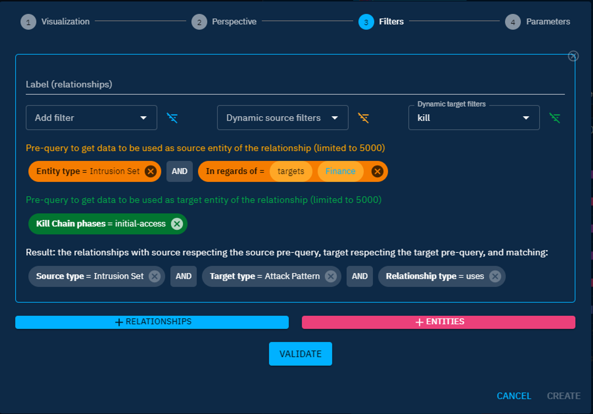 - Dynamic filters on the source (Orange): Narrow down the data by filtering on intrusion sets targeting the finance sector.
