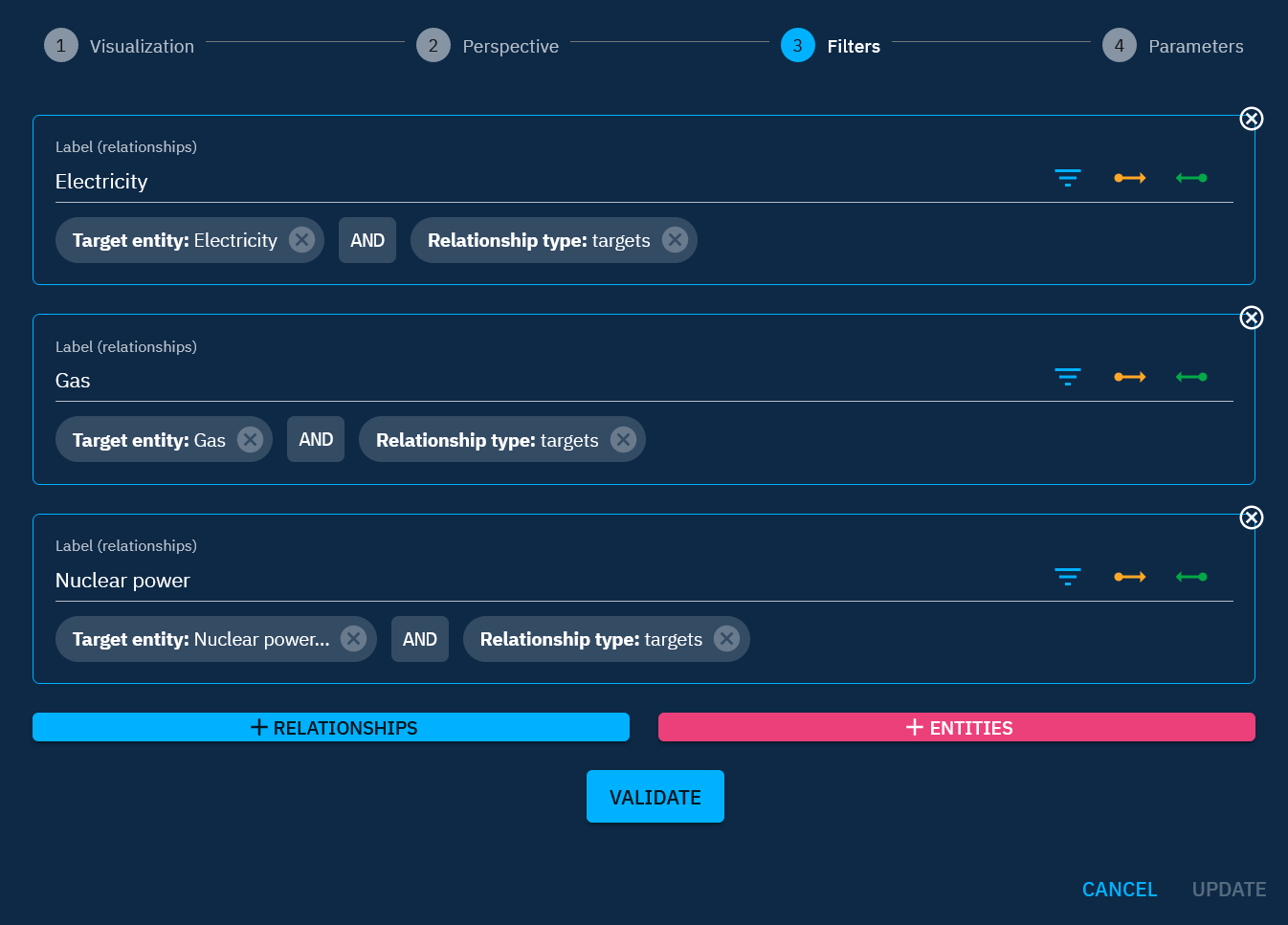 - Dynamic filters on the target (green): Refine data by filtering on entities positioned as the target (in the "to" position) of the relationship.