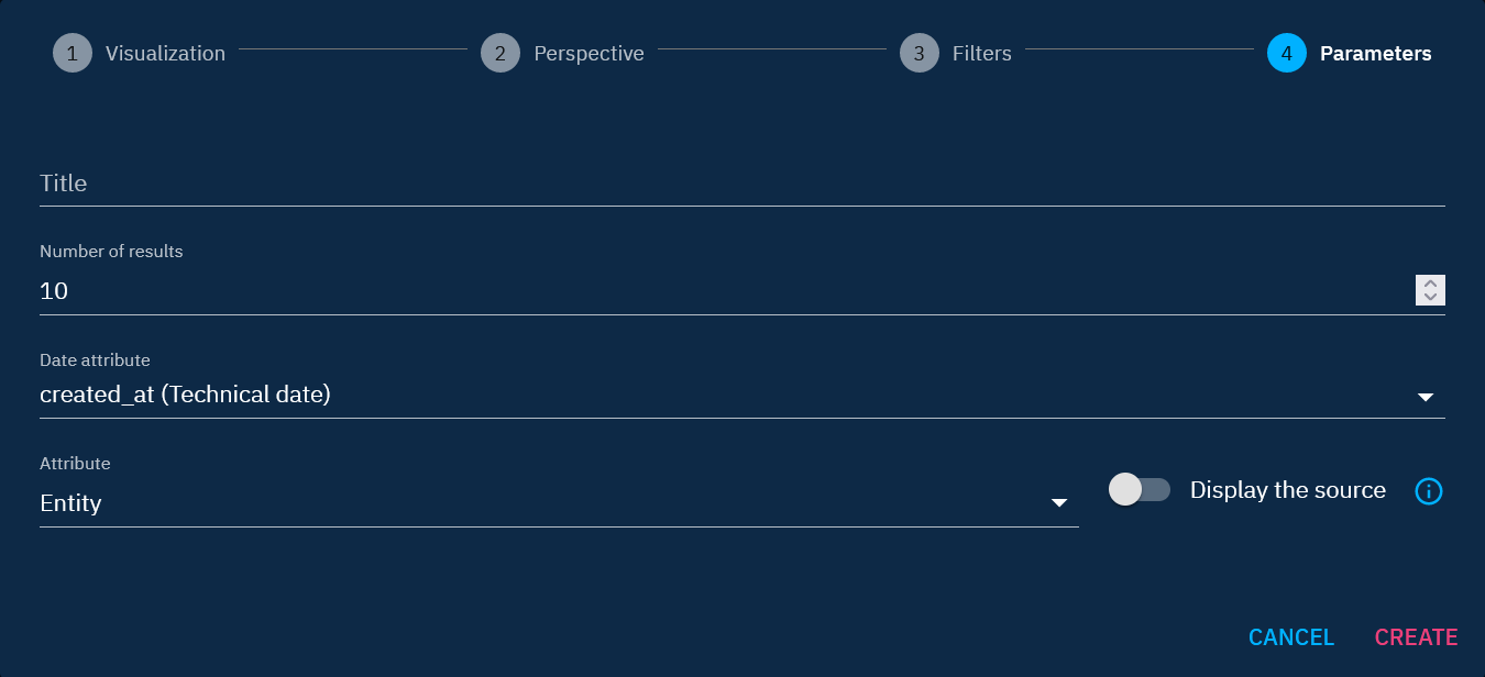 Parameters depend on the chosen visualization and allow users to define widget titles, choose displayed elements from the filtered data, select data reference date, and configure various other parameters specific to each visualization.