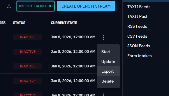 You can export your existing OpenCTI Stream from the platform, making it easy to share your configuration with others.