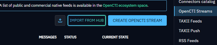 If you have a JSON OpenCTI Stream file you can import it by clicking on the icon next to "Import from hub"