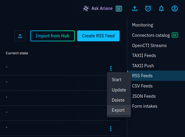 If your OpenCTI instance is registered on the XTM Hub, you can directly import RSS Feeds in 1 click from XTM Hub. After a confirmation popup, it will open the creation drawer with everything prefilled where you can adjust the config before creating the ingester.